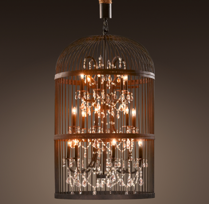 SPECIAL REMARKS:Inspired by a vintage birdcage, our reproduction juxtaposes rustic hand-wrought iron with a precision-cut faceted crystal pendant. Handcrafted in authentic detail and hung from a 3"-thick weathered marine rope, the cage has a hinged side door to facilitate bulb replacements.